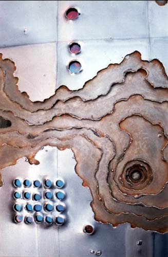 Detail of Two Voices Singing, showing the colouring of the stainless steel inserts and the textures of the oxidised surfaces.