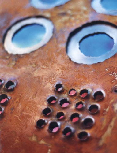 Detail showing some of the surface texture of the oxides and the colouring of the stainless steel inserts.