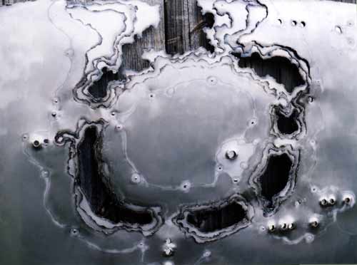 Detail of Nucleus showing some of the stainless steel inserts in their craters, and showing some of the surface markings both brushed into the steel, and marked with pencil.