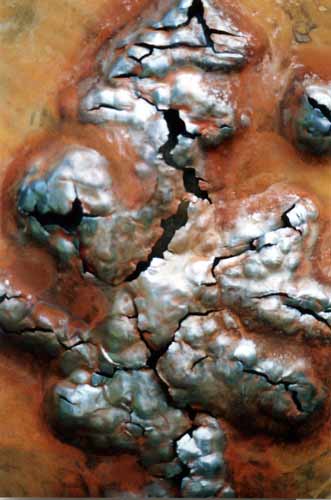 Flat acid orange, intense heat blue cracked relief features with an aureole of firey red burned oxide. Destructive processes that Shiva herself would be proud of. Love it.